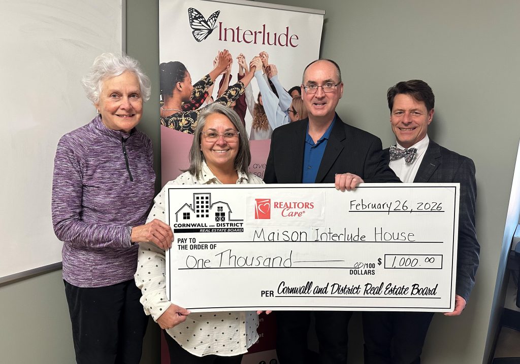 On February 26, 2026, the Cornwall and District Real Estate Board presented a $1,000 cheque to Interlude – MIH. This grant was made possible thanks to the generous contributions from REALTOR® Members of the CDREB through the REALTORS Care® Foundation. The CDREB is proud to support such a wonderful organization and the important work they do within our community.